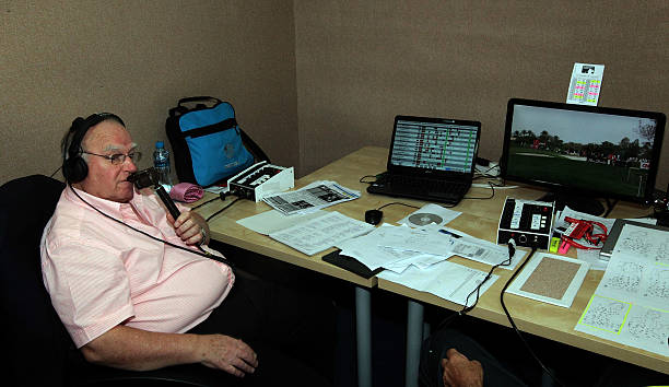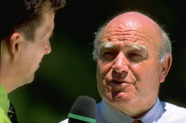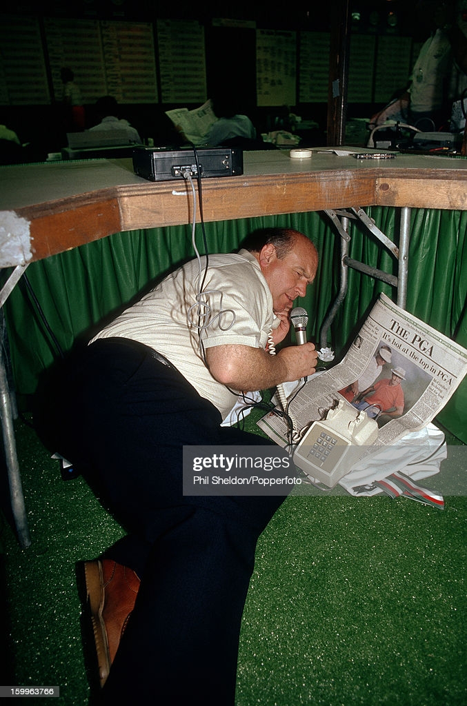 Renton Laidlaw broadcasting from under a table at the 1987 PGA Championship held at the PGA National Golf Club in Palm Beach, Florida (Photo by Phil Sheldon/Getty Images)